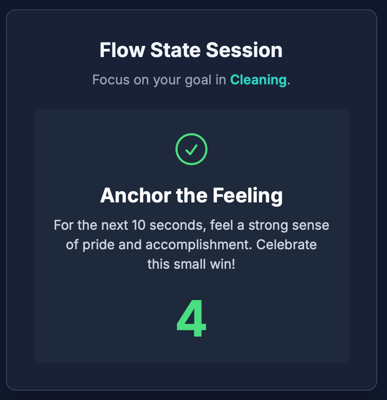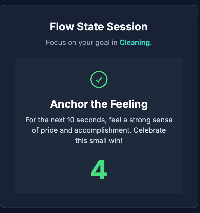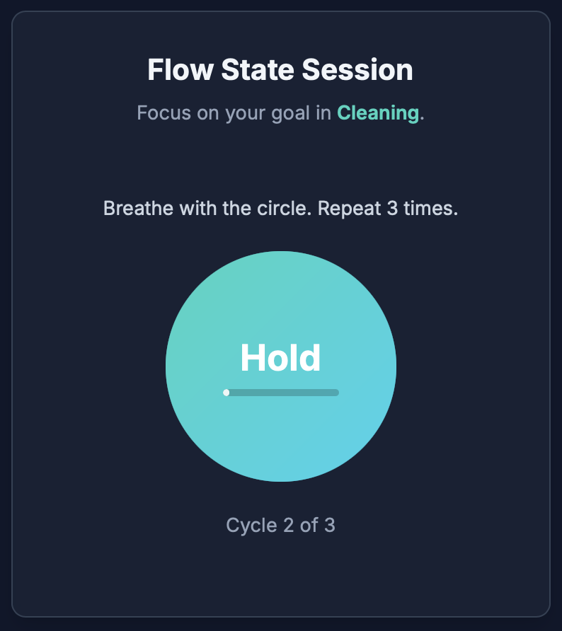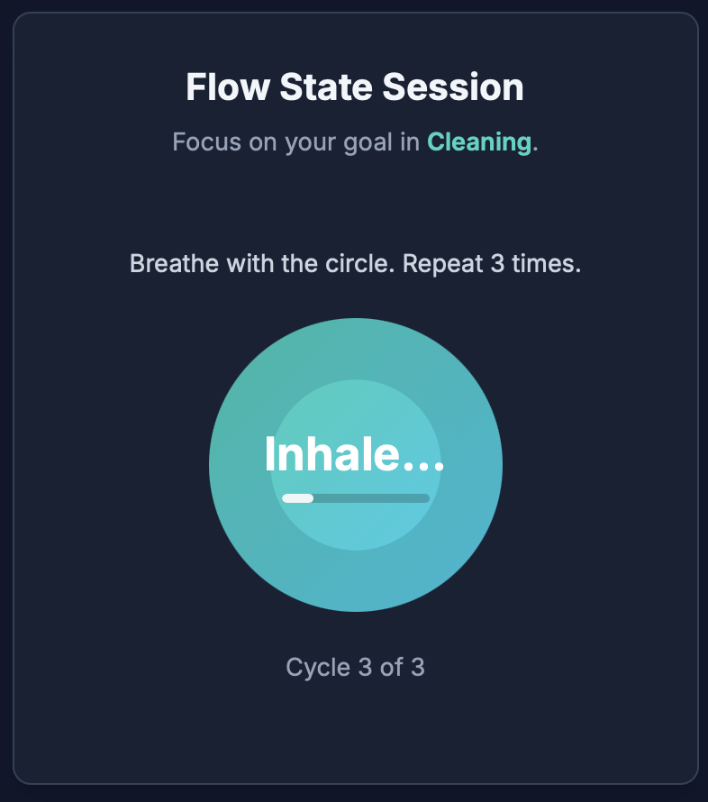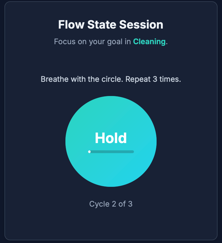 Guided Breathing (4-4-6): After your action, you'll be guided to inhale for 4 seconds, hold for 4, and exhale for 6. This pattern activates your parasympathetic nervous system, inducing calm and deep focus.