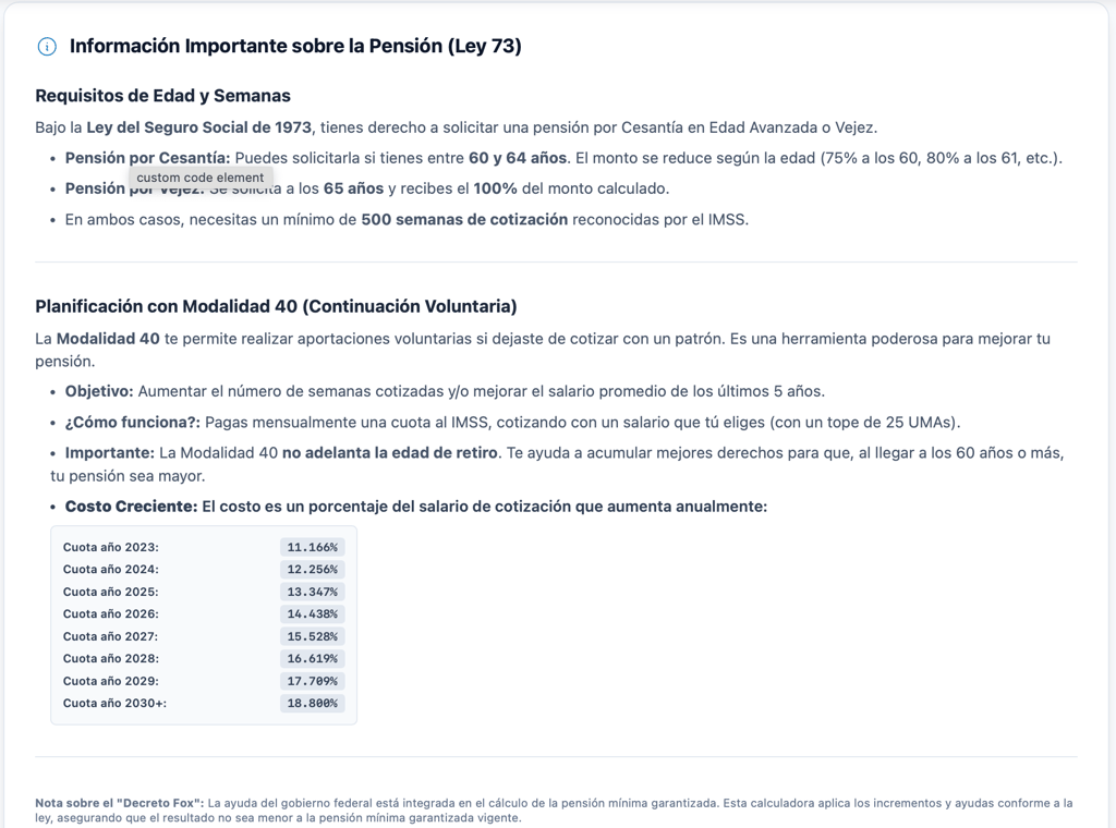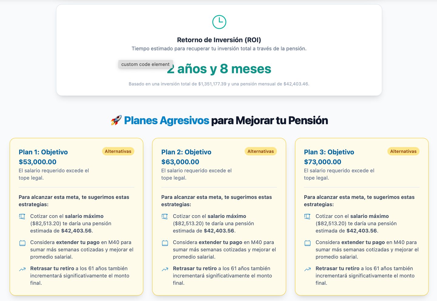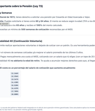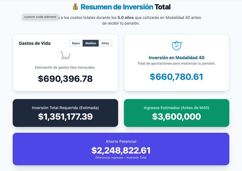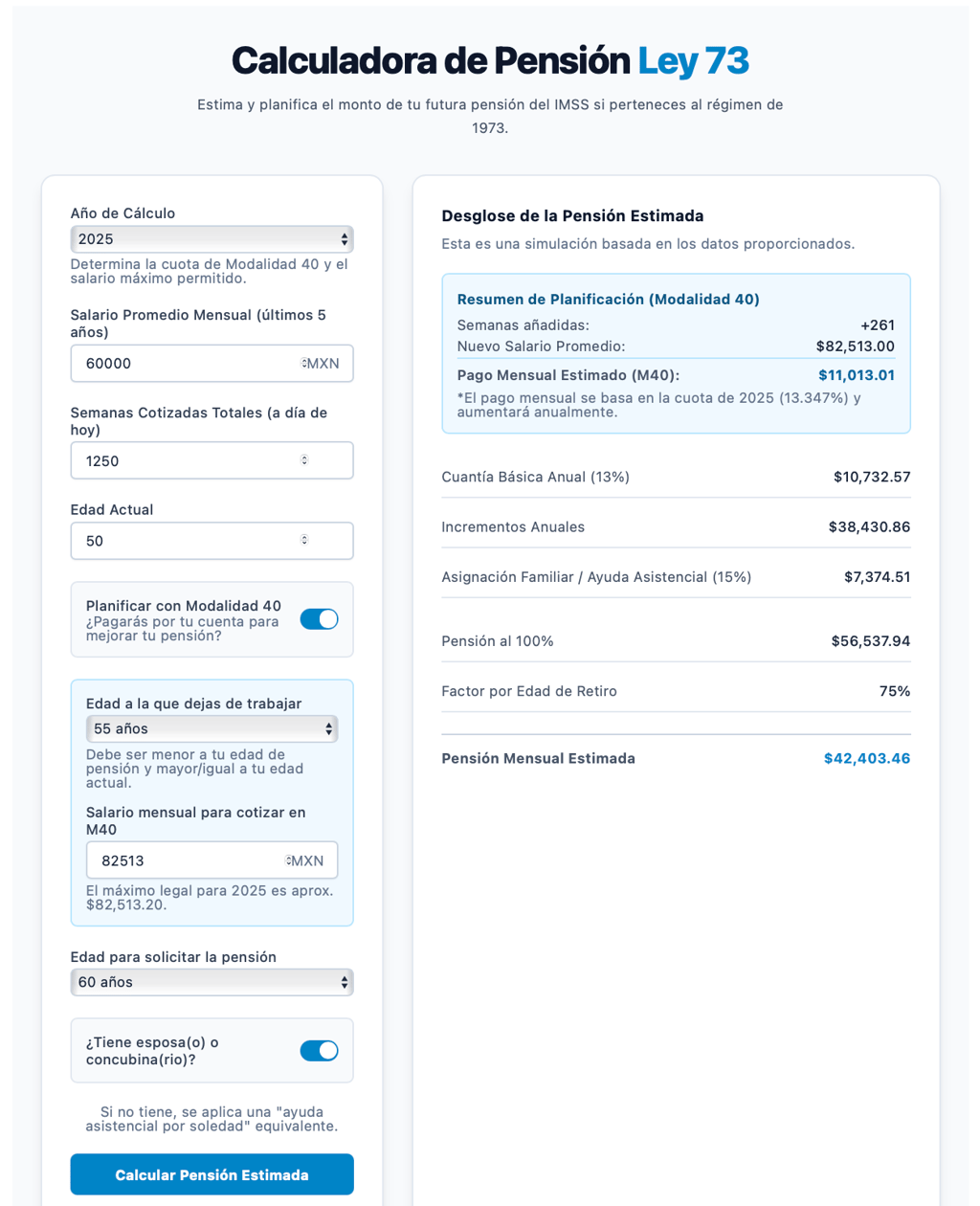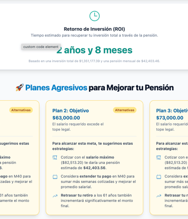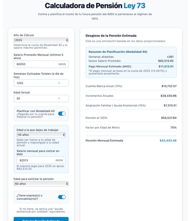 Calcula tu Pensión conforme a la Ley 73 y modalidad 40, gastos de vida, Inversión y Retorno de tu Inversión.