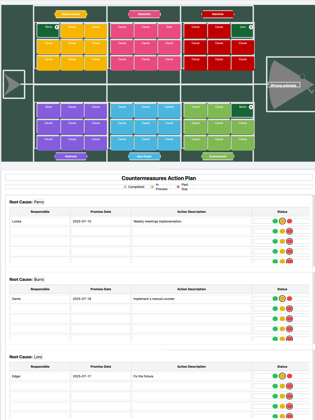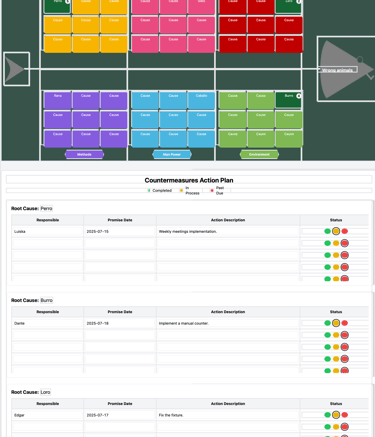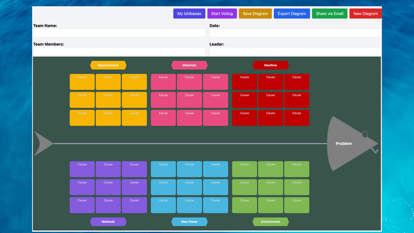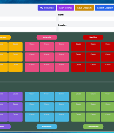 Analyze problems effectively with our Ishikawa diagram tool, semiautomatic voting system and Countermeasures template with color code status. Local backup, e-mail sharing and browser saving.