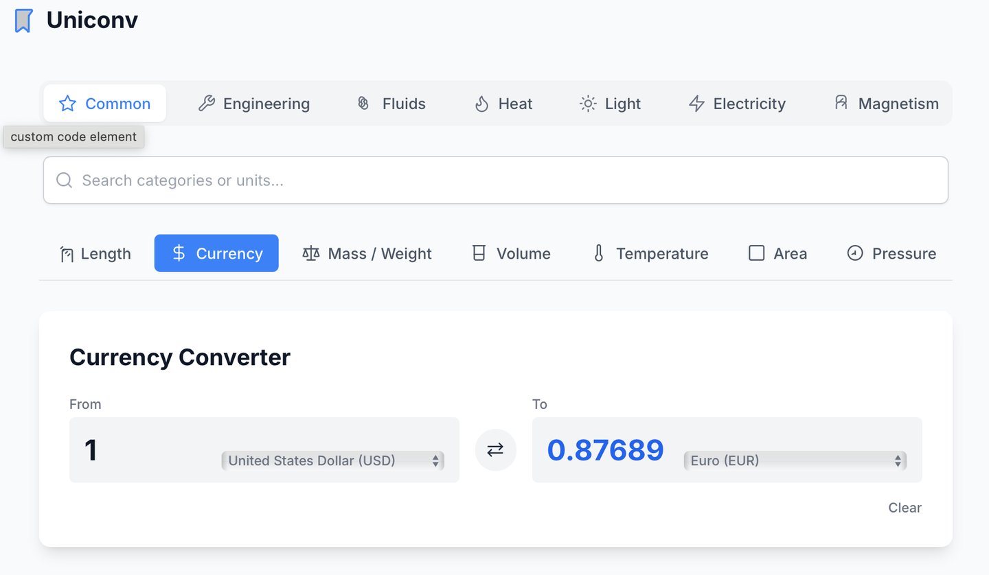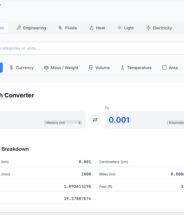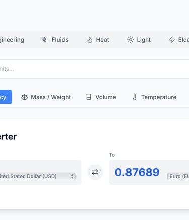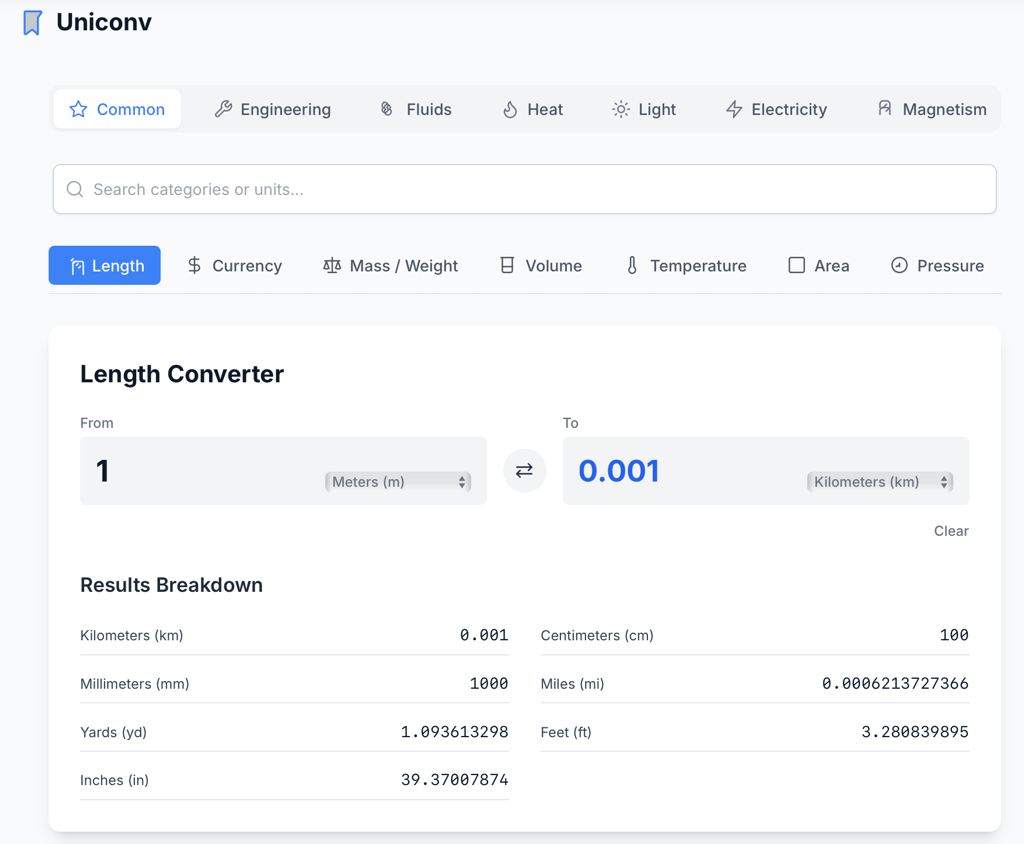 Real-Time Length, Currency, Mass/Weight, Volume, Temperature, Area, Pressure, Energy, Time, Speed, Power, Force, Angle, Fuel Consumption, Data Storage, Density, Torque, Acceleration, Moment of Inertia, Flow-Volume, Viscosity-Dynamic, Temperature Interval, Thermal Conductivity, Luminance, Illumination, Charge, Current, Voltage, Resistance, Magnetic Flux, Magnetic Flux Density, Radiation – Activity, Radiation – Absorbed Dose, Radiation – Equivalent Dose, Data Transfer Rate, Typography, Volume – Lumber.